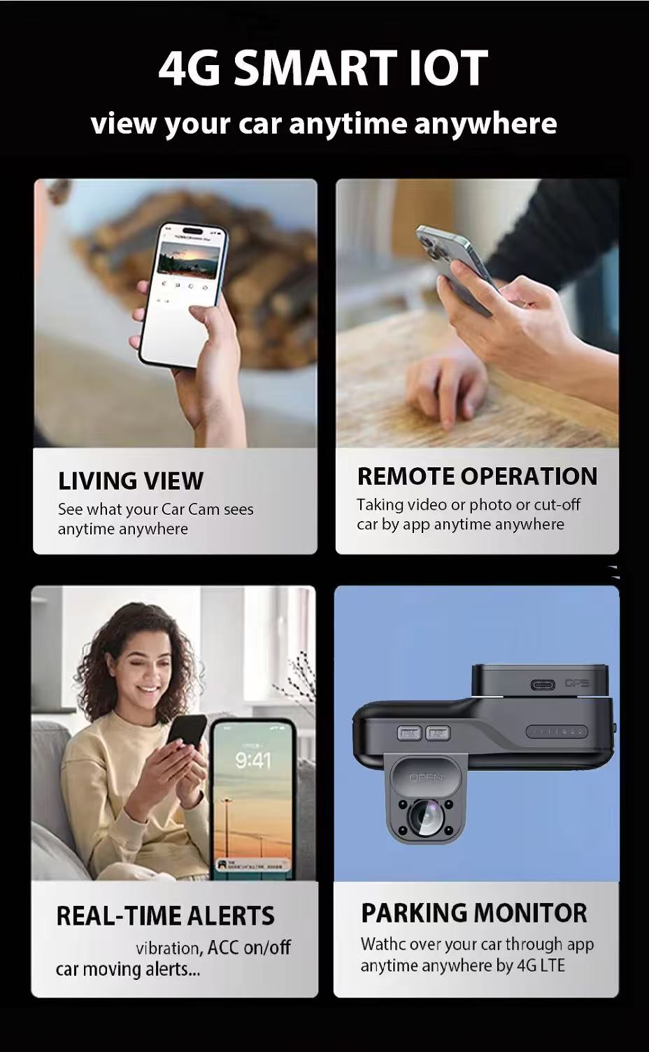 The main functions of the APP are: real-time replay, one-click car search, parking guard, and cloud video